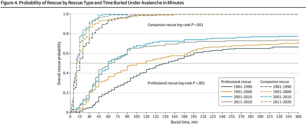 La combinazione di una migliore consapevolezza, istruzione, strumenti e tecniche per il soccorso in caso di valanga ha dimostrato che il tasso di sopravvivenza complessivo è notevolmente migliorato rispetto al tasso riscontrato negli anni ’80.