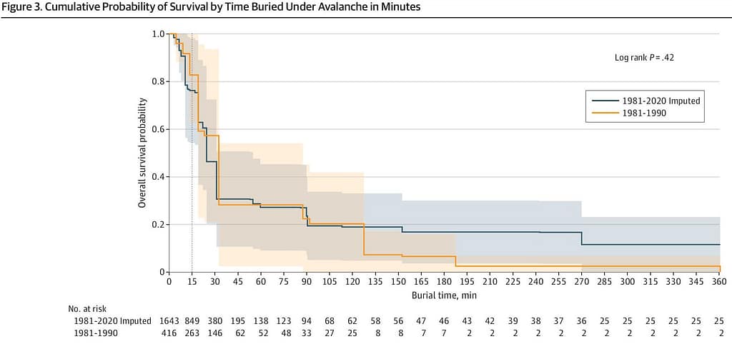 Questa è stata la prima analisi che ha chiarito quanto fosse critico il tempo di salvataggio per migliorare la sopravvivenza delle vittime di sepoltura. Nello studio iniziale, i ricercatori hanno scoperto che le vittime sepolte avevano 15 minuti per sopravvivere prima che si verificasse un rapido calo del tasso di sopravvivenza, dovuto all’asfissia sotto la neve.