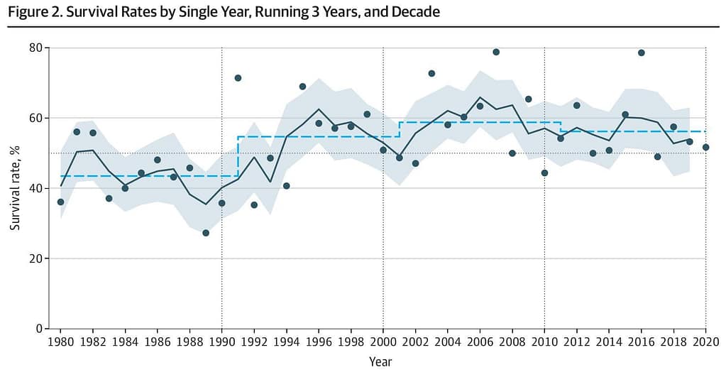 Sebbene ci siano stati anni anomali con una sopravvivenza migliorata negli anni ’10, gli anni 2000 hanno avuto la sopravvivenza complessiva più elevata, il che suggerisce che le ottimizzazioni nel soccorso effettuate in questi due decenni potrebbero aver aiutato alcuni, ma che hanno avuto un impatto relativamente minore rispetto alle innovazioni degli anni ’80 e ’90, quando le migliori pratiche di soccorso erano meno consolidate.